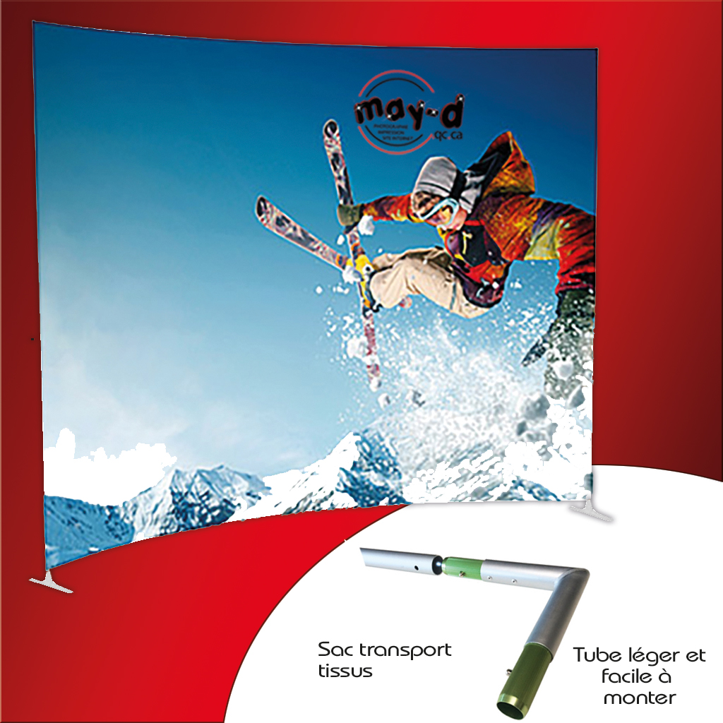 Kiosque tubulaire en forme de courbe. Léger et facile à monter.  Il s’adapte à la gamme contour qui offre d’autres kiosques/présentoirs dans sa gamme. Il est livré avec un sac de transport en tissus.